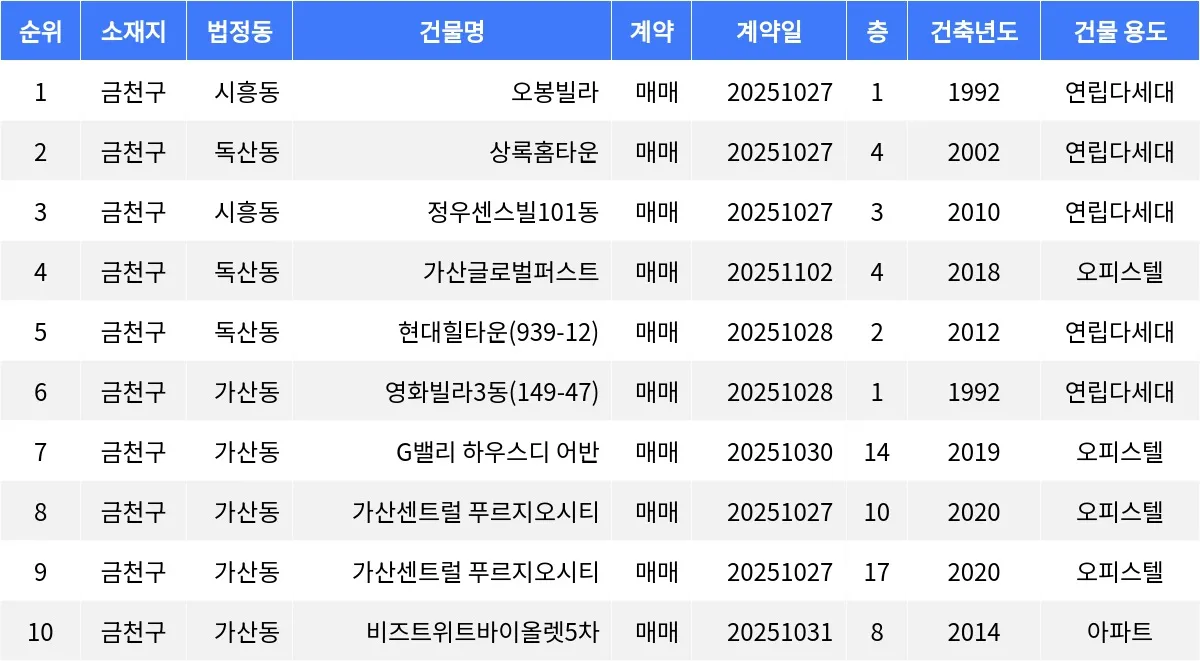 독산동 가산글로벌퍼스트 28.5㎡ 4층 매물이 2억1천5백만원에 매매됐다. 독산동 현대힐타운 29.58㎡ 2층 매물은 1억9천5백만원에 거래됐다.