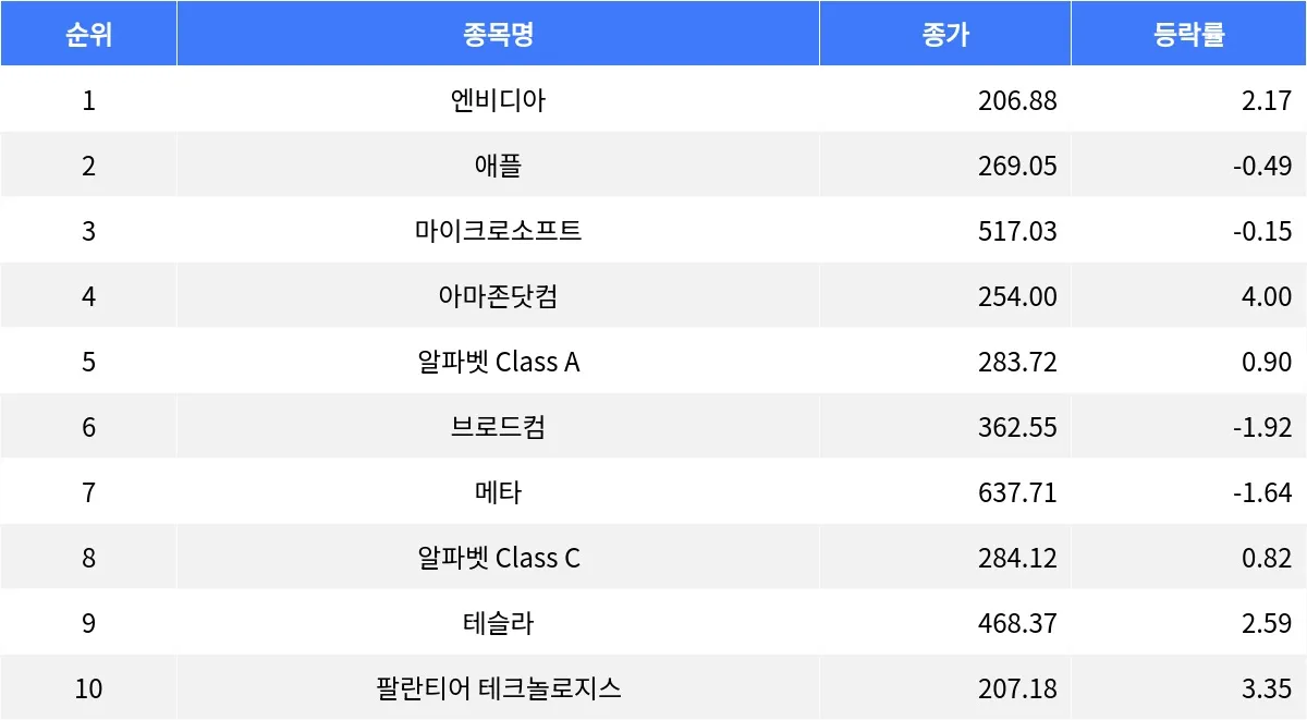 엔비디아는 전 거래일 대비 2.17% 상승한 206달러 88센트에 거래를 마감했다. 거래량은 1억 7천 755만 6천 349주로, 전일비 4.39달러 상승했다. 아마존닷컴 역시 4.00% 급등하며 254달러에 마감했고, 거래량은 9천 245만 9천 531주로 전일비 9.78달러 상승했다. 테슬라도 2.59% 상승한 468달러 37센트로 거래를 마쳤다.