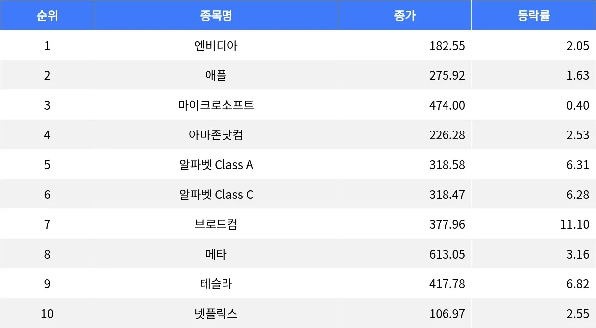 주요 상승 종목으로는 브로드컴이 11.10% 상승하며 377.96달러에 거래를 마쳤다. 거래량은 4천 661만 1천 280주로 전 거래일 대비 37.76만 주 증가했다. 테슬라는 6.82% 급등하며 417.78달러에 마감했고, 거래량은 9천 614만 5천 115주로 전 거래일 대비 26.69만 주 늘었다. 알파벳 Class A와 Class C는 각각 6.31%, 6.28% 상승하며 318.58달러, 318.47달러를 기록했다. 이들 종목의 거래량은 각각 8천 328만 4천 266주, 5천 408만 4천 610주로 집계됐다.