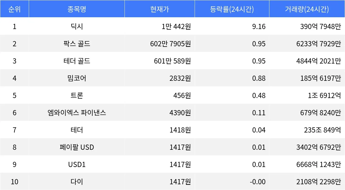 글로벌 가상자산 시황 중계 사이트 코인마켓캡(CoinMarketCap)에 따르면, 최근 암호화폐 시장에서 딕시가 가장 높은 24시간 상승률을 기록하며 주목받고 있다. 딕시는 현재 1만 442원에 거래되고 있으며, 24시간 동안 9.16% 상승했다. 1시간 등락률도 3.77%로 짧은 시간 내에 빠르게 상승하고 있다. 거래량은 390억 7948만 주로, 활발한 거래가 이루어지고 있다.