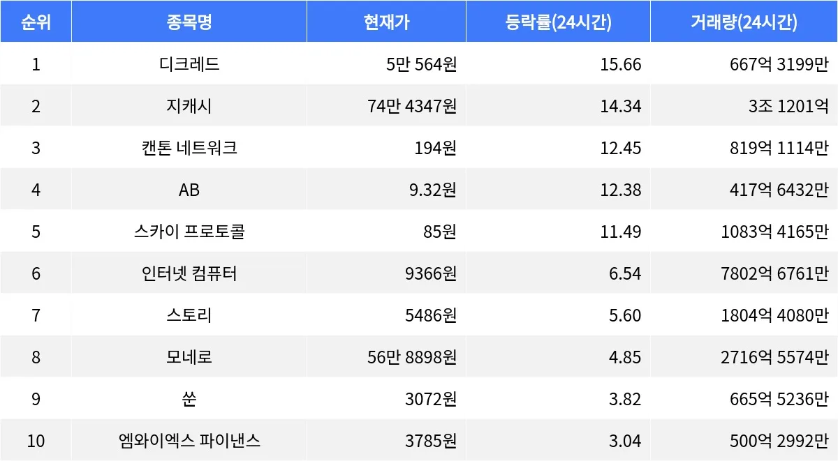 인터넷 컴퓨터는 24시간 동안 6.54% 상승하며 현재 9366원에 거래되고 있다. 스토리는 24시간 동안 5.60% 상승하며 5486원에 거래되고 있다. 모네로는 24시간 동안 4.85% 상승하며 현재 56만 8898원에 거래되고 있다. 쑨은 24시간 동안 3.82% 상승하며 3072원에 거래되고 있으며, 엠와이엑스 파이낸스는 3.04% 상승하며 3785원에 거래되고 있다.