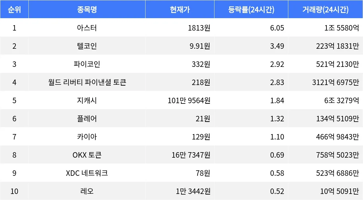 글로벌 가상자산 시황 중계 사이트 코인마켓캡(CoinMarketCap)에 따르면, 암호화폐 시장에서 아스터가 24시간 동안 가장 높은 상승률을 기록했다. 아스터는 현재 1813원에 거래되고 있으며, 24시간 동안 6.05% 상승했다. 1시간 등락률은 1.70% 상승으로, 단기적으로도 상승세를 이어가고 있는 모습이다. 아스터의 24시간 거래량은 1조 5580억 원으로 집계되며, 시가총액은 3조 6588억 원으로 시가총액 순위 39위를 기록하고 있다.