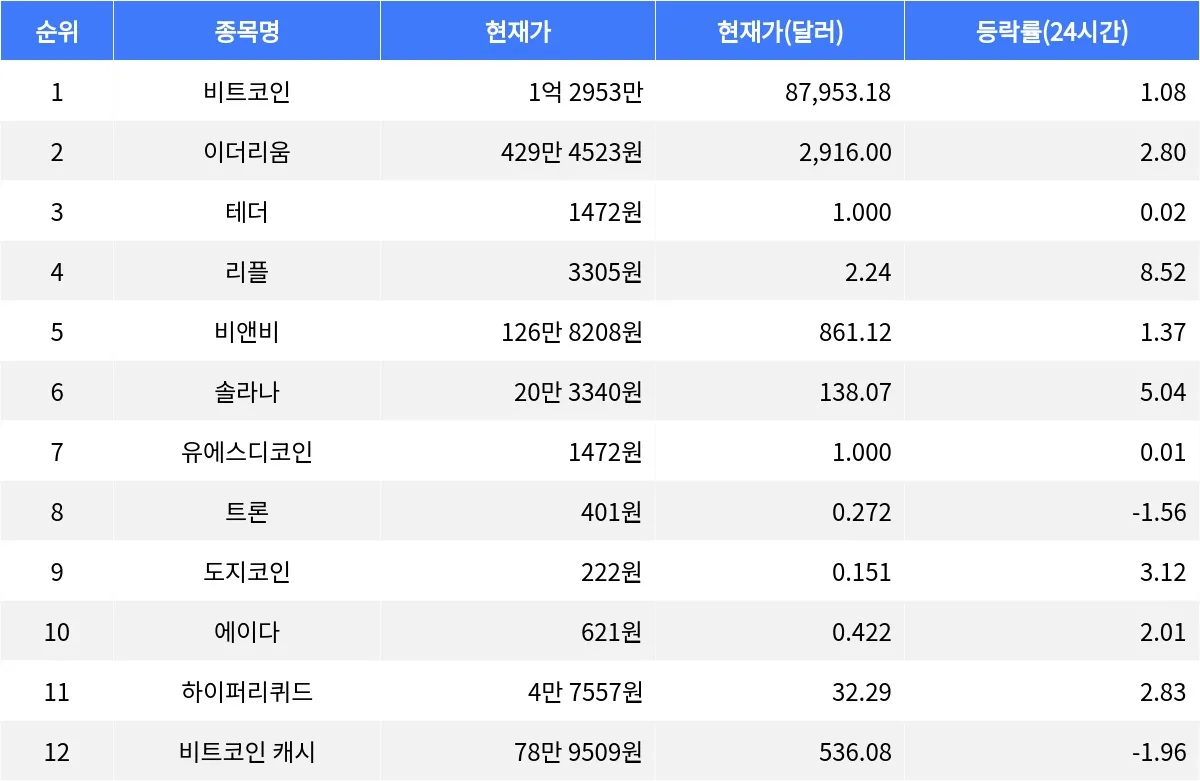 리플은 3305원으로 8.52% 상승하며, 거래량은 9조 642억원을 기록했다. 리플은 금융 기관 간의 실시간 결제 시스템을 지원하며, 낮은 수수료와 빠른 거래 속도가 특징이다.