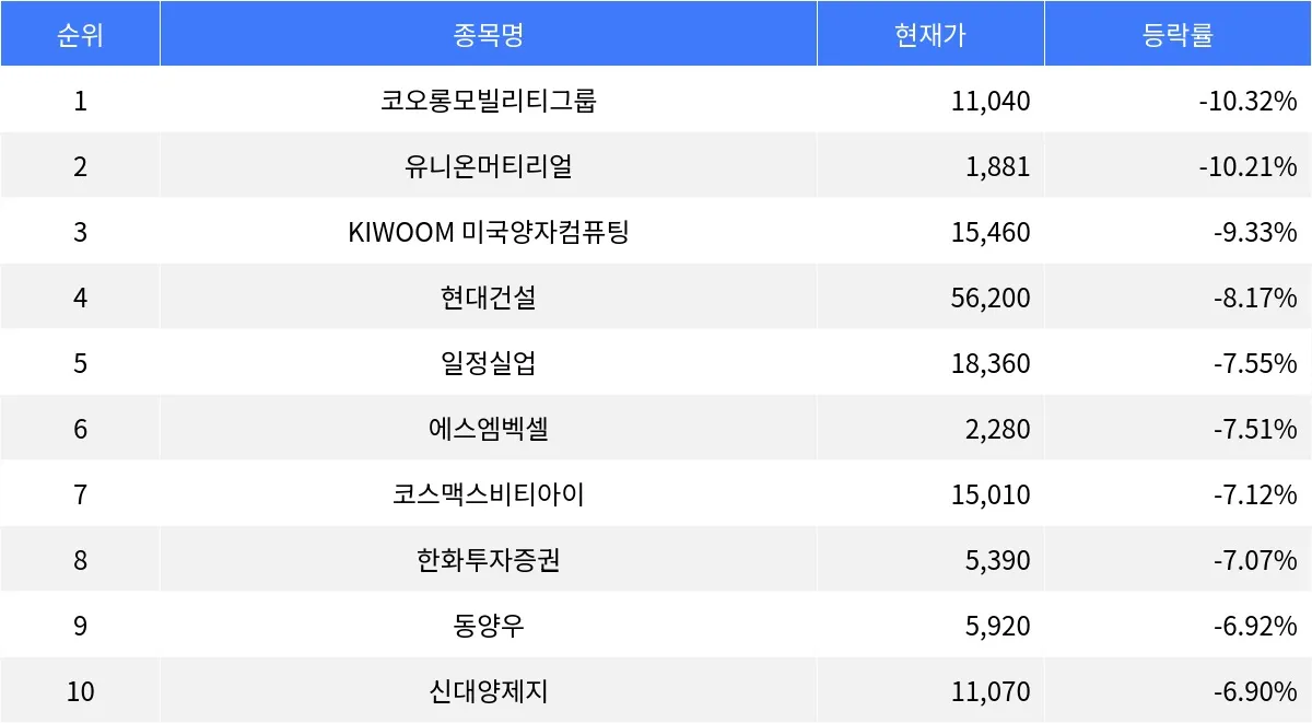 6위 에스엠벡셀(010580)은 등락률 -7.51%로 2,280원에, 7위 코스맥스비티아이(044820)는 -7.12%로 15,010원에 거래를 마쳤다. 8위 한화투자증권(003530)은 -7.07%로 5,390원을 기록했으며, 9위 동양우(001525)는 -6.92%로 5,920원에, 10위 신대양제지(016590)는 -6.90%로 11,070원에 장을 마쳤다.