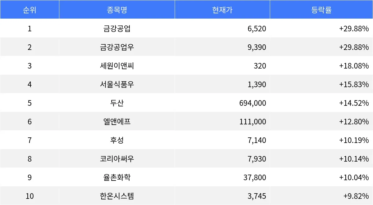 금강공업우도 동반 상승, 두산과 세원이앤씨도 주목받아