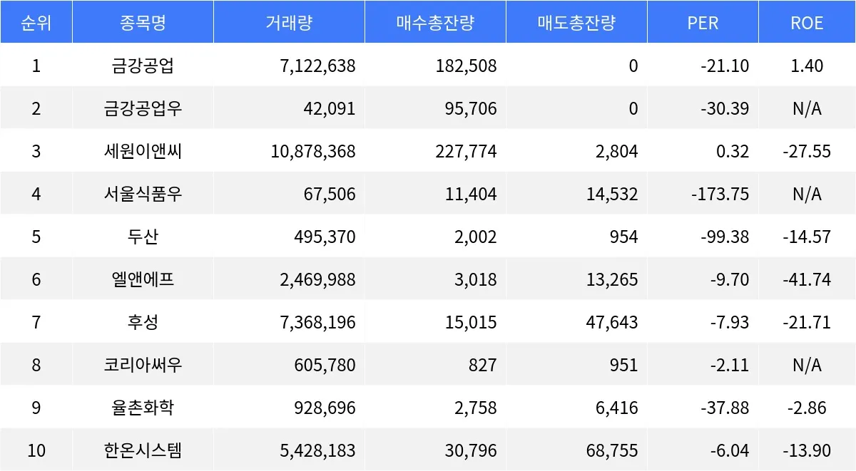 금강공업의 거래량은 7,122,638주였고, 매수총잔량은 182,508주, 매도총잔량은 0주로 매수세가 강했다. PER은 -21.10이며 ROE는 1.40이다. 금강공업우는 거래량이 42,091주, 매수총잔량은 95,706주, 매도총잔량은 0주로 역시 매수세가 우세했다. PER은 -30.39이고 ROE는 제공되지 않았다. 세원이앤씨는 10,878,368주가 거래되었으며, 매수총잔량은 227,774주, 매도총잔량은 2,804주로 매수세가 강세를 보였다. PER은 0.32, ROE는 -27.55이다. 서울식품우는 거래량이 67,506주, 매수총잔량은 11,404주, 매도총잔량은 14,532주로 매도세가 다소 우세했다. PER은 -173.75로 나타났고, ROE는 제공되지 않았다. 두산은 495,370주가 거래됐으며, 매수총잔량은 2,002주, 매도총잔량은 954주로 매수세가 우세했다. PER은 -99.38이고 ROE는 -14.57이다.