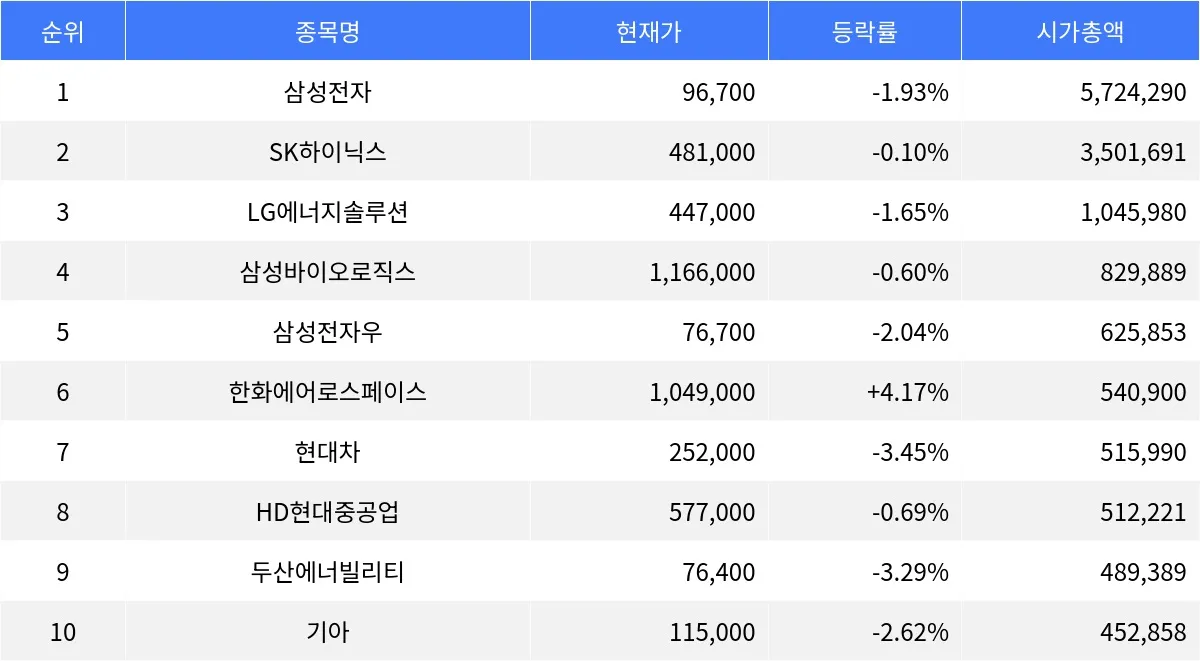 LG에너지솔루션(373220)은 447,000원으로 전 거래일 대비 1.65% 하락했다. 삼성바이오로직스(207940)는 1,166,000원으로 0.60% 하락했다. 현대차(005380)는 252,000원으로 3.45% 하락하며 가장 큰 하락폭을 기록했다. HD현대중공업(329180)은 577,000원으로 0.69% 하락했다. 두산에너빌리티(034020)는 76,400원으로 3.29% 하락했고, 기아(000270)는 115,000원으로 2.62% 하락했다.