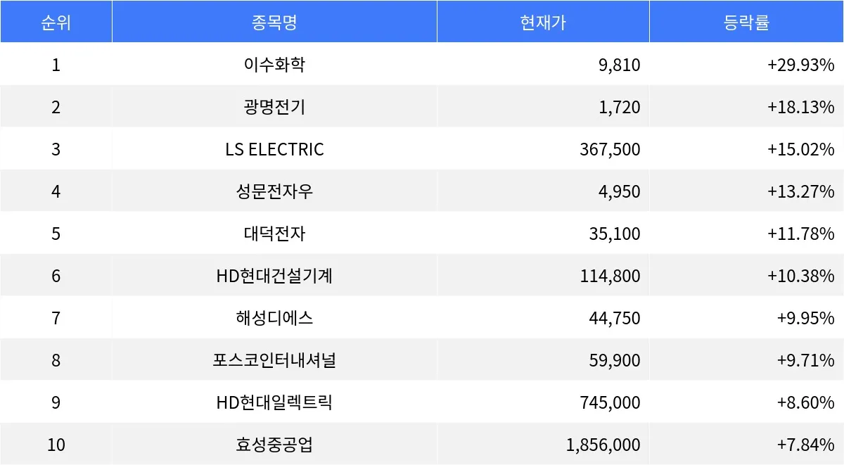 23일 장 마감 기준, 이수화학(005950)이 등락률 +29.93%로 1위를 차지했다.