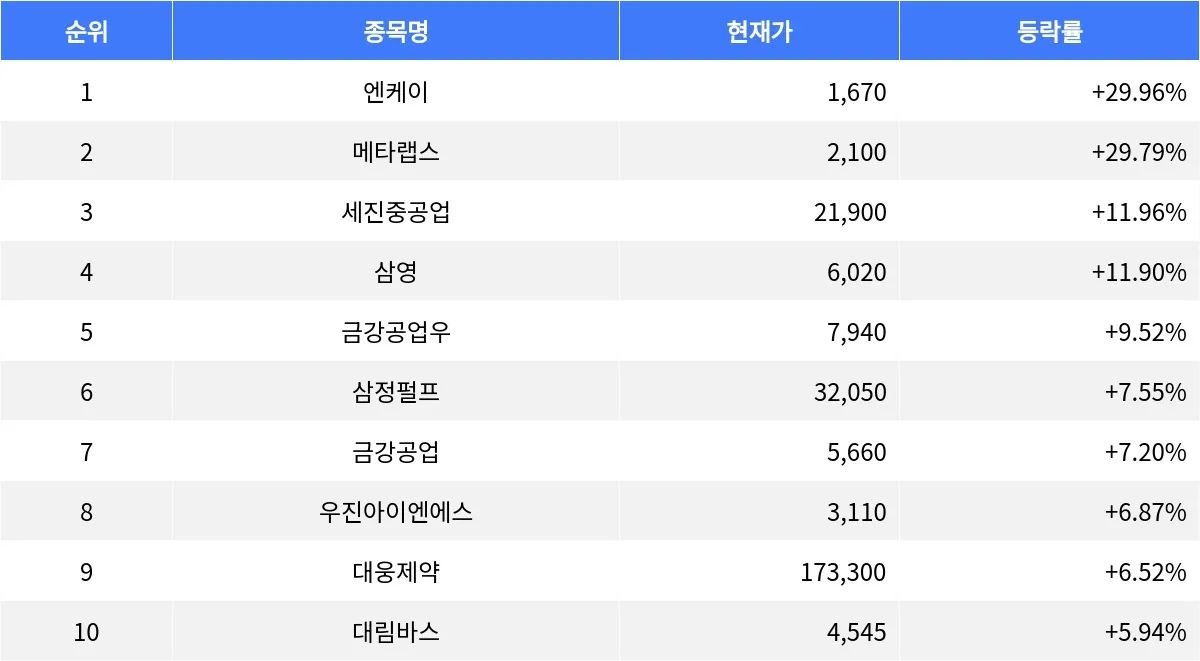 14일 장 마감 기준, 엔케이(085310)이 등락률 +29.96%로 1위를 차지했다.