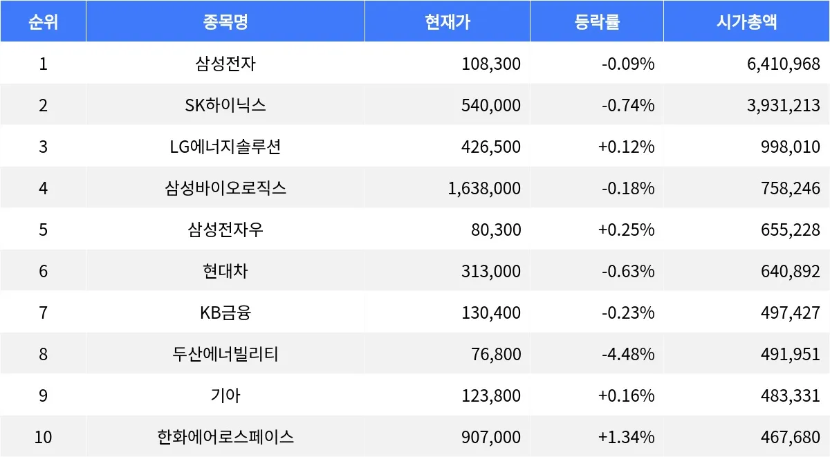 삼성전자 -0.09%, SK하이닉스 -0.74%, LG에너지솔루션 +0.12%...