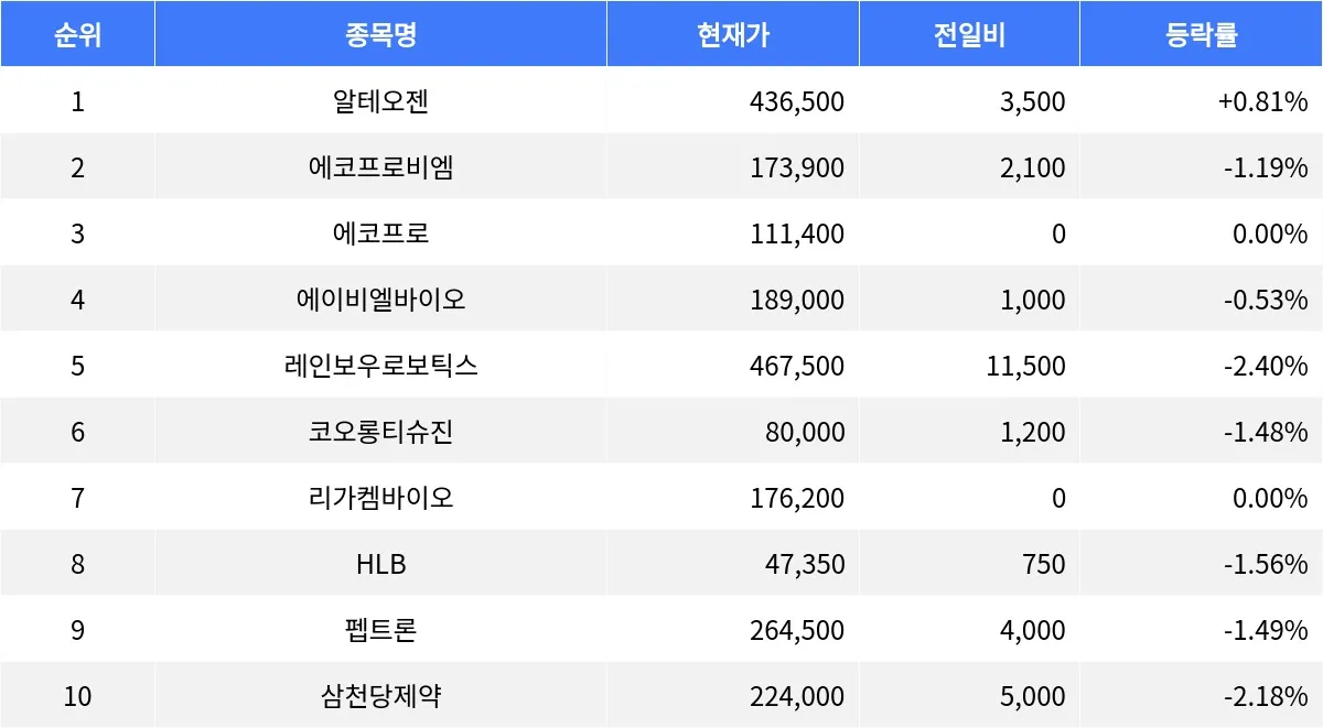 시가총액 3위 에코프로(086520)는 현재가 111,400원으로 보합세를 보이며, 거래량은 346,605주다. 리가켐바이오(141080)는 176,200원으로 가격 변동 없이 거래되고 있으며, 거래량은 16,723주에 달한다.