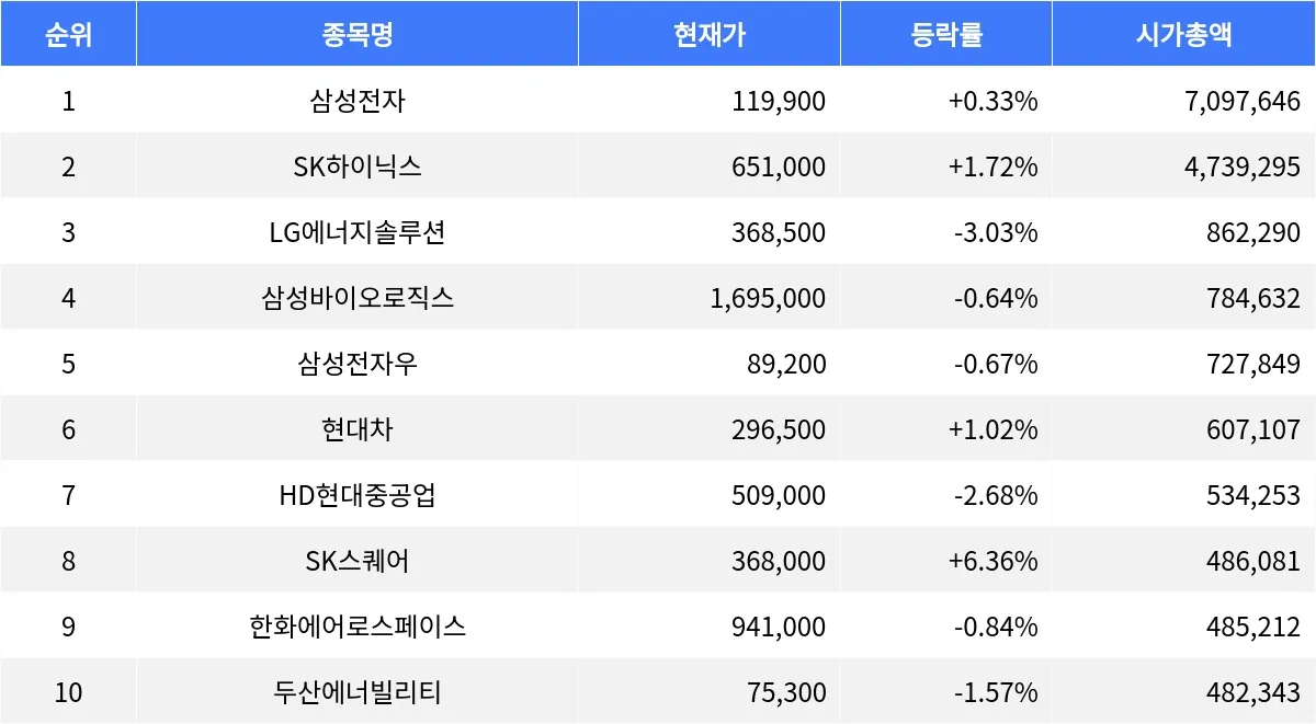 31일 한국거래소에 따르면, 시가총액 1위 삼성전자(005930)는 현재가 119,900원으로 전 거래일 대비 0.33% 상승세를 보인다. 삼성전자의 외국인비율은 52.34%에 달하며, PER은 24.90, ROE는 9.03으로 나타나 안정적인 재무 지표를 유지하고 있다. SK하이닉스(000660)는 651,000원으로 1.72% 상승하며, 거래량은 3,618,367주로 집계되었다. 외국인비율은 53.82%이며, PER은 13.28, ROE는 31.06으로 긍정적인 수치를 기록하고 있다.