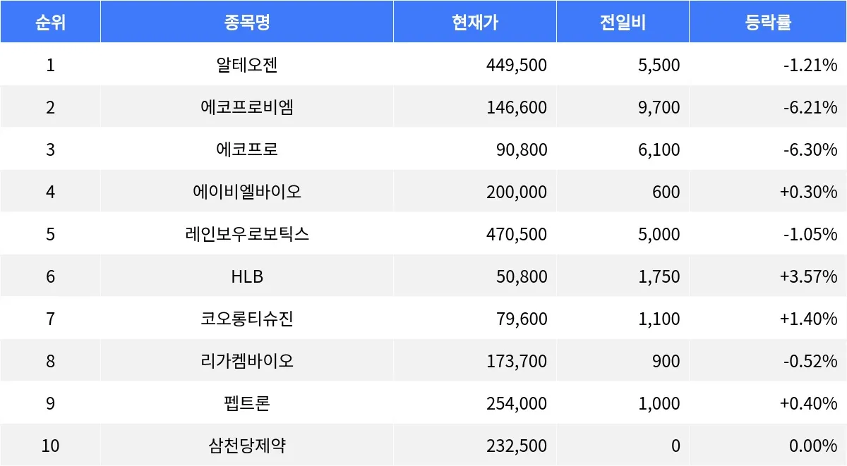 반면, 에코프로(086520)는 90,800원으로 6.30% 하락하며, 거래량은 2,823,903주로 높은 거래량을 보이고 있다. 레인보우로보틱스(277810)는 470,500원으로 1.05% 하락하고 있으며, 거래량은 139,105주다. 리가켐바이오(141080)는 173,700원으로 0.52% 하락하며, 거래량은 241,336주다. 펩트론(087010)은 254,000원으로 0.40% 상승 중이며, 거래량은 231,111주다. 삼천당제약(000250)은 232,500원으로 보합세를 유지하고 있으며, 거래량은 105,104주다.