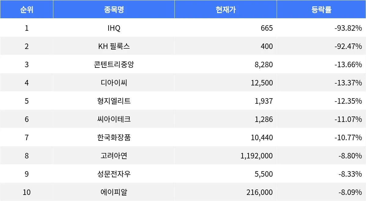 IHQ와 KH 필룩스 등 주요 종목 대규모 하락세 기록