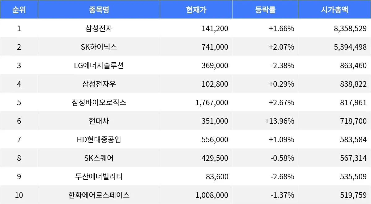 상승세를 보인 종목으로는 삼성바이오로직스(207940)가 1,767,000원으로 2.67% 오르며 두각을 나타냈고, 현대차(005380)는 351,000원으로 13.96% 급등하여 주목받았다. HD현대중공업(329180)도 556,000원으로 1.09% 상승하며 마감했다.