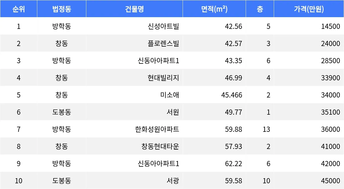 창동 플로렌스빌 42.57㎡ 3층 매물이 2억4천만원에 거래됐다. 방학동 신동아아파트1 43.35㎡ 6층 매물은 2억8천5백만원에 새로운 주인을 찾았다.