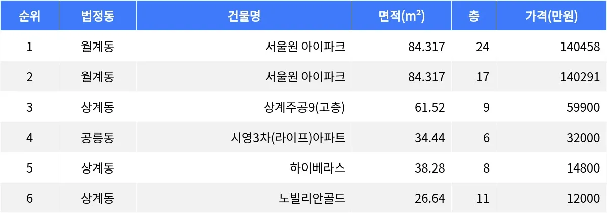 월계동 서울원 아이파크 84.317㎡ 17층 매물은 14억291만원에 거래됐다. 상계동 상계주공9 61.52㎡ 9층 매물은 5억9천9백만원에 거래됐다.
