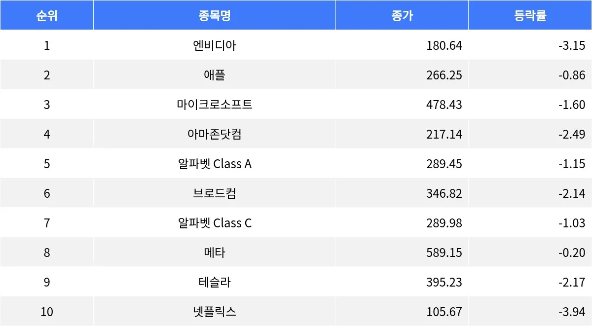 알파벳 Class A와 Class C 모두 각각 -1.15%와 -1.03% 하락하며 289.45달러와 289.98달러로 마감했다. 브로드컴은 -2.14% 하락한 346.82달러를 기록했으며, 넷플릭스는 -3.94% 하락한 105.67달러로 거래를 마쳤다.