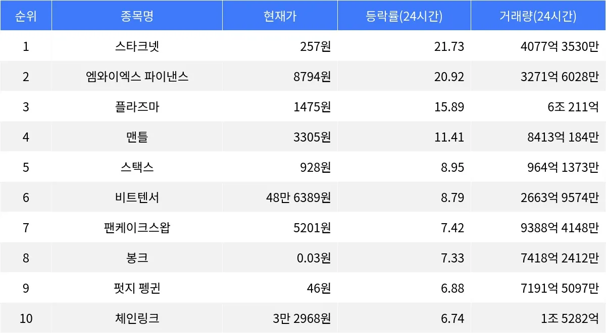 비트텐서는 24시간 동안 8.79% 상승하며 48만 6389원에 거래되고 있고, 팬케이크스왑은 7.42%의 상승률을 기록하며 5201원에 거래 중이다. 봉크는 7.33% 상승하여 0.03원에 거래되고 있으며, 펏지 펭귄은 6.88% 상승하여 46원에 거래 중이다. 체인링크는 6.74% 상승하며 3만 2968원에 거래되고 있다.
