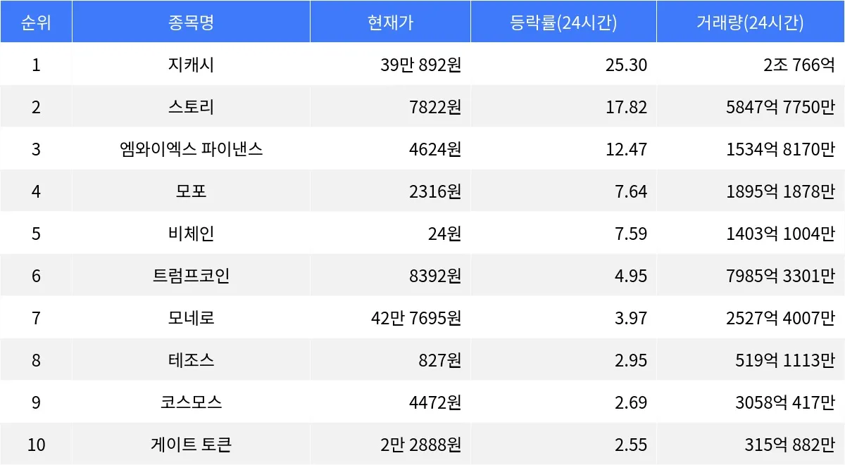 한편, 트럼프코인은 24시간 동안 4.95% 상승하며 현재 8392원에 거래되고 있다. 모네로는 3.97% 상승하며 42만 7695원에 거래 중이다. 테조스는 2.95% 상승하며 827원에, 코스모스는 2.69% 상승하며 4472원에 거래되고 있으며, 게이트 토큰은 2.55% 상승하여 2만 2888원에 거래 중이다.