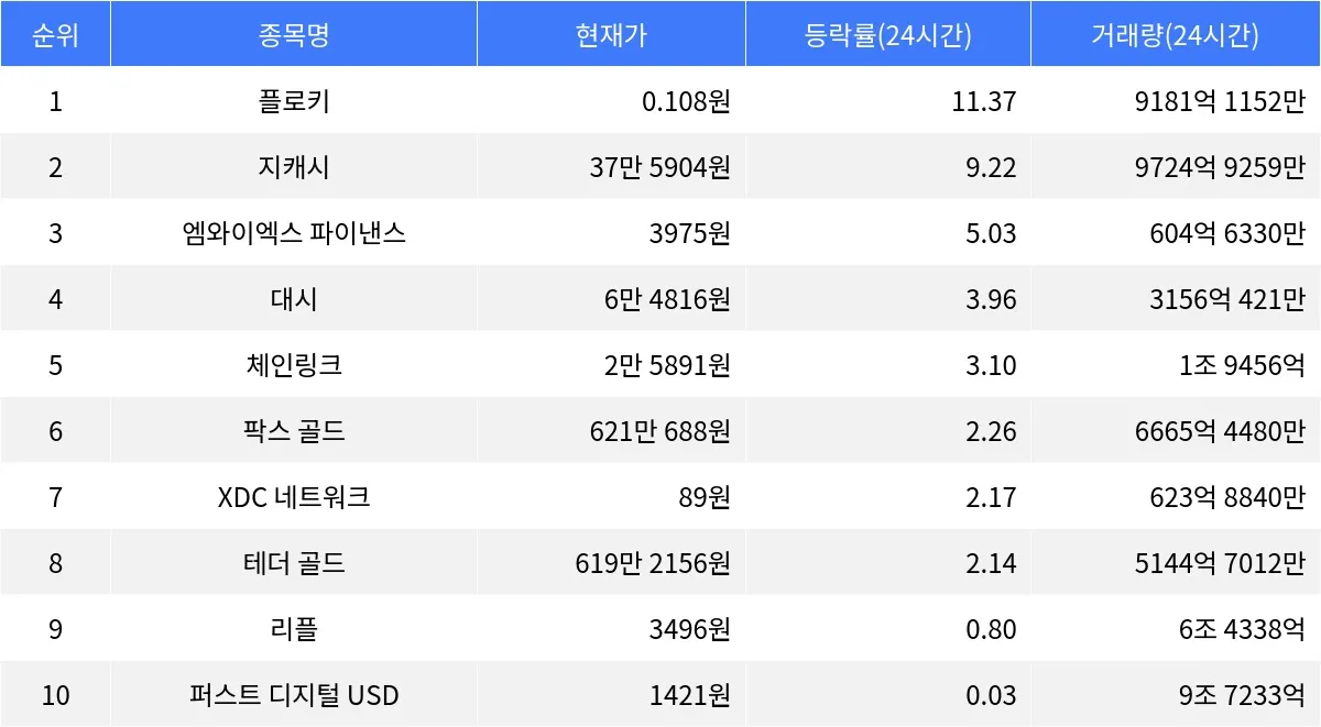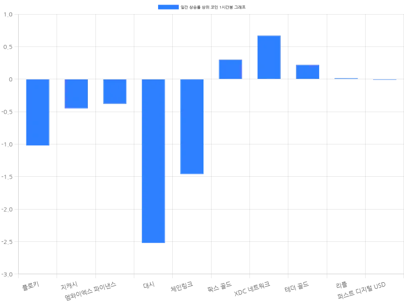 팍스 골드는 24시간 동안 2.26% 상승하며 현재 621만 688원에 거래되고 있으며, 1시간 동안 0.30%의 소폭 상승을 보였다. XDC 네트워크는 24시간 동안 2.17% 상승하며 89원에 거래되고 있으며, 1시간 동안 0.67% 상승을 기록하며 단기 상승세를 이어가고 있다.