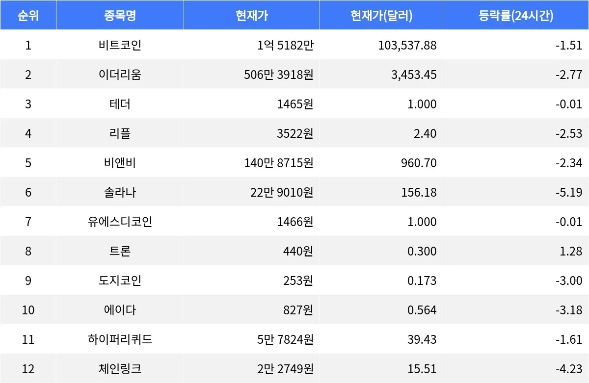 같은 시각 리플은 3522원으로 2.53% 하락했고, 거래량은 5조 7019억원이다. 리플의 시가총액은 211조 7176억원이다. 리플은 금융 기관 간의 빠르고 저렴한 국제 송금을 가능하게 하는 프로토콜로, 중앙화된 시스템에서 운영된다.