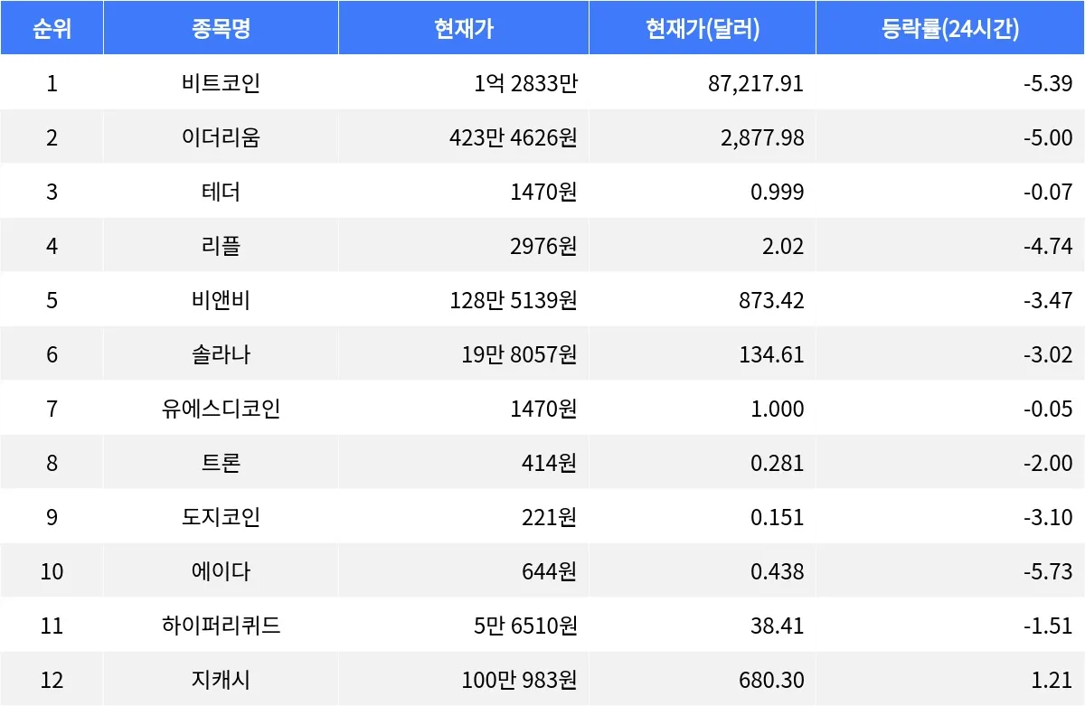 21일 10시 30분 글로벌 가상자산 시황 중계 사이트 코인마켓캡(CoinMarketCap)에 따르면, 비트코인의 현재가는 1억 2833만원이며, 24시간 동안 5.39% 하락했다. 비트코인은 시가총액 2560조 2912억원을 기록하고 있으며, 거래량은 140조 9884억원에 달한다. 비트코인은 탈중앙화된 디지털 화폐로, 블록체인 기술을 기반으로 하여 거래의 투명성과 보안을 제공한다.