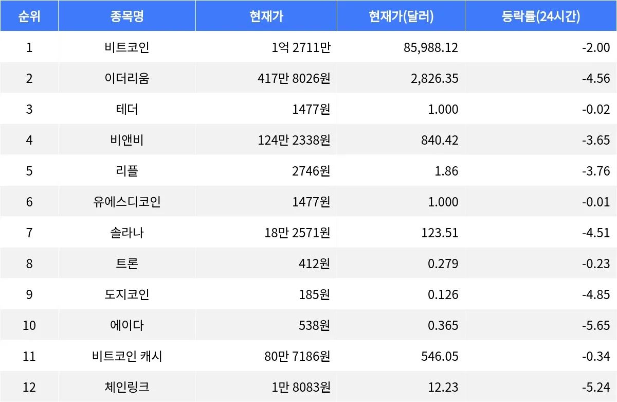 도지코인은 185원으로 4.85% 하락했다. 도지코인은 인터넷 밈을 기반으로 생성된 암호화폐로, 주로 팁이나 소액 결제에 사용된다. 거래량은 2조 465억원이다.