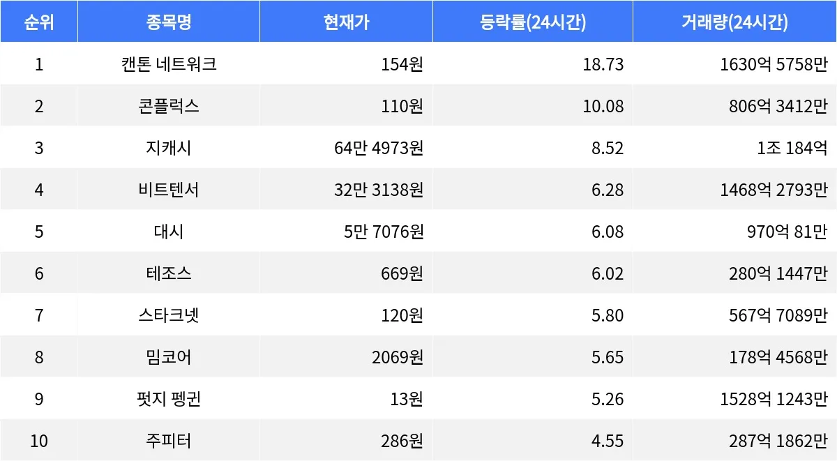 글로벌 가상자산 시황 중계 사이트 코인마켓캡(CoinMarketCap)에 따르면, 최근 암호화폐 시장에서 캔톤 네트워크가 24시간 동안 가장 높은 등락률을 기록하며 주목받고 있다. 캔톤 네트워크는 18.73% 상승하며 현재 154원에 거래되고 있으며, 24시간 거래량은 1630억 5758만 원에 달한다. 하지만 1시간 등락률은 -0.59%를 기록하여 단기적 조정이 발생할 가능성도 있다. 시가총액 순위는 25위로, 시가총액은 5조 6397억 원이다.
