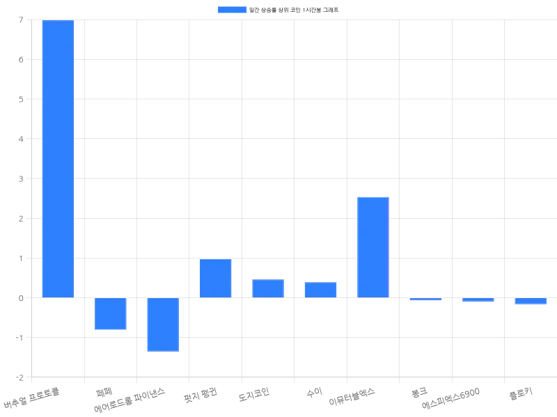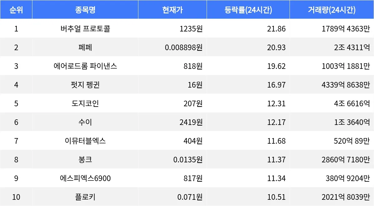 수이는 24시간 동안 12.17% 상승하여 2419원에 거래되고 있으며, 1시간 동안 0.39% 상승한 상태이다. 이뮤터블엑스는 11.68% 상승하며 404원에 거래되고 있으며, 1시간 동안 2.53% 상승하며 추가 상승세를 보이고 있다. 봉크는 11.37% 상승하여 0.0135원에 거래되고 있으며, 1시간 동안 -0.06%의 소폭 하락을 보였다. 에스피엑스6900은 11.34% 상승하며 817원에 거래 중이고, 플로키는 10.51% 상승하여 0.071원에 거래되고 있다.