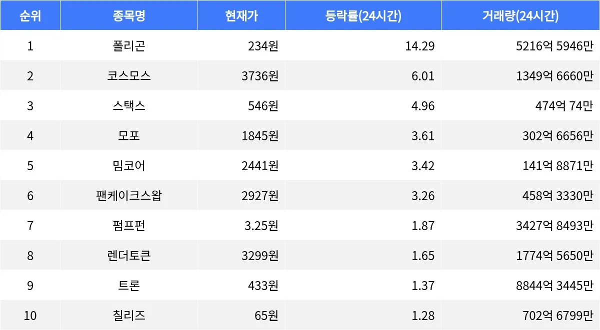 글로벌 가상자산 시황 중계 사이트 코인마켓캡(CoinMarketCap)에 따르면, 암호화폐 시장에서 폴리곤은 24시간 동안 가장 높은 상승률을 기록하며 주목받고 있다. 폴리곤은 현재 234원에 거래되고 있으며, 24시간 동안 14.29% 상승했다. 1시간 동안은 2.63% 추가 상승을 보이며 상승세가 지속되고 있다. 시가총액은 약 2조 4796억 원으로, 이는 시가총액 순위 48위에 해당한다. 24시간 거래량은 5216억 5946만 원에 달한다.
