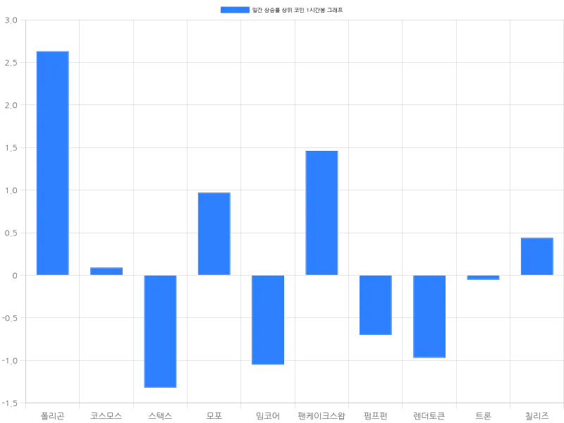 한편, 팬케이크스왑은 24시간 동안 3.26% 상승하며 2927원에 거래되고 있다. 1시간 내에는 1.46% 상승하여 상승세를 이어가고 있다. 펌프펀은 1.87% 상승하며 3.25원에 거래되고 있으며, 1시간 동안 0.70% 하락했다. 렌더토큰은 1.65% 상승하며 3299원에 거래되고 있으며, 1시간 동안 0.97% 하락했다. 트론은 1.37% 상승하며 433원에 거래되고 있으며, 1시간 동안 0.05% 하락했다. 칠리즈는 1.28% 상승하며 65원에 거래되고 있으며, 1시간 동안 0.44% 상승했다.