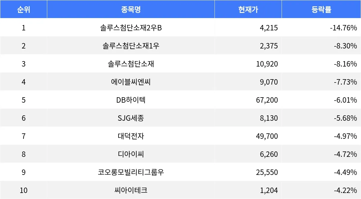 그 외에 등락률을 기록한 종목으로는 SJG세종(033530)가 -5.68%로 현재가 8,130원, 대덕전자(353200)가 -4.97%로 현재가 49,700원, 디아이씨(092200)가 -4.72%로 현재가 6,260원, 코오롱모빌리티그룹우(45014K)가 -4.49%로 현재가 25,550원, 마지막으로 씨아이테크(004920)가 -4.22%로 현재가 1,204원을 기록했다.