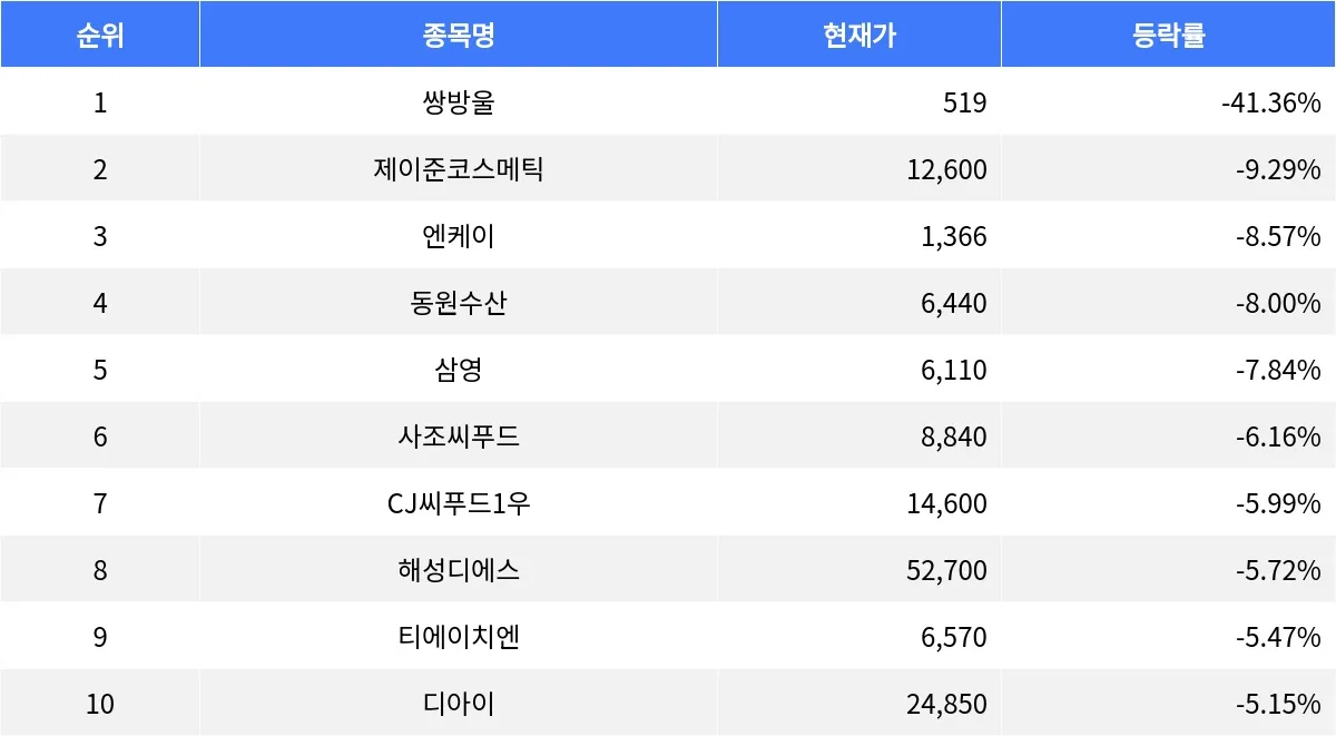 20일 장 마감 기준, 쌍방울(102280)이 등락률 -41.36%로 1위를 차지했다. 쌍방울의 현재가는 519원이며, 거래량은 6,816,430주였다. 매수총잔량과 매도총잔량은 각각 5,972주와 44,729주로 매도세가 강했다. PER은 -6.83, ROE는 -9.62로 나타났다.