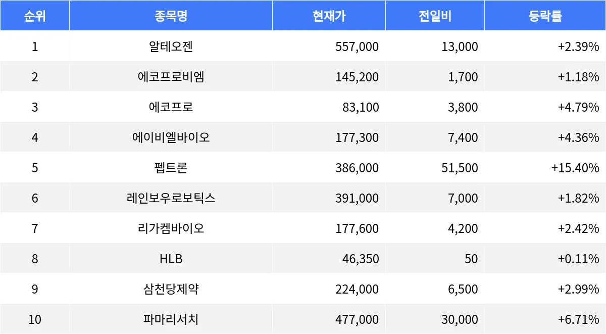 에코프로(086520)는 83,100원으로 4.79% 상승했으며, 거래량은 2,723,017주로 활발한 거래를 보였다. 에이비엘바이오(298380)는 177,300원으로 4.36% 오르며 거래량 1,750,952주를 기록했다. 펩트론(087010)은 386,000원으로 15.40% 급등하며, 거래량은 544,653주로 집계되었다. 레인보우로보틱스(277810)는 391,000원으로 1.82% 상승하며 거래량 139,198주를 기록했다. 리가켐바이오(141080)는 177,600원으로 2.42% 상승했으며 거래량은 374,997주였다. 삼천당제약(000250)은 224,000원으로 2.99% 상승하며 거래량 117,016주를 기록했다. 파마리서치(214450)는 477,000원으로 6.71% 상승하며 거래량 186,089주로 마감했다.