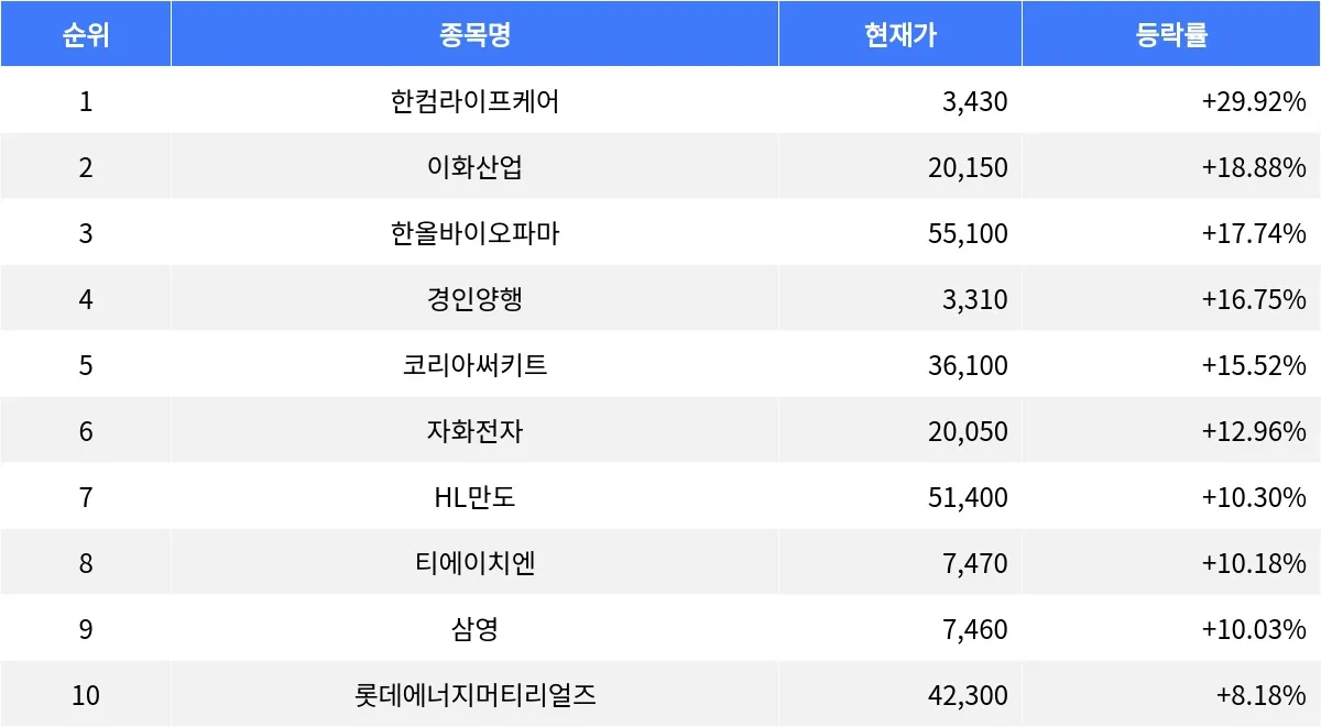 자화전자(033240)는 등락률 12.96%로 20,050원이었다. HL만도(204320)는 등락률 10.30%로 51,400원이었다. 티에이치엔(019180)은 등락률 10.18%로 7,470원이었다. 삼영(003720)은 등락률 10.03%로 7,460원이었다. 롯데에너지머티리얼즈(020150)는 등락률 8.18%로 42,300원이었다.