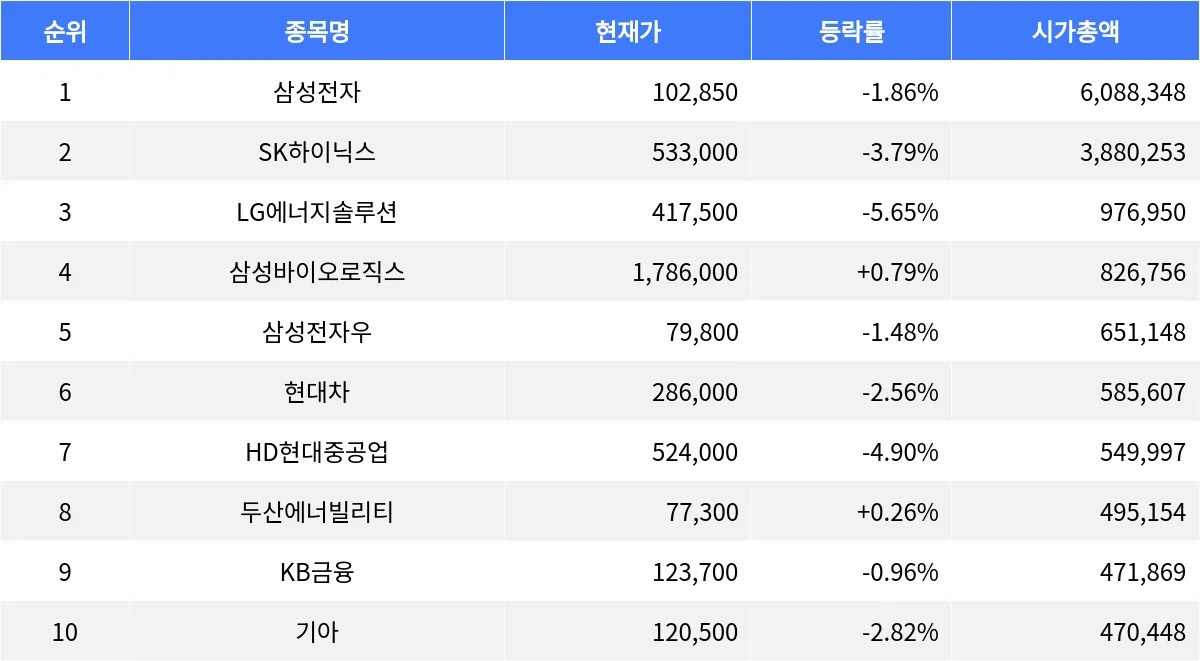 코스피 시가총액 상위 종목들이 전반적으로 하락세를 보였다.