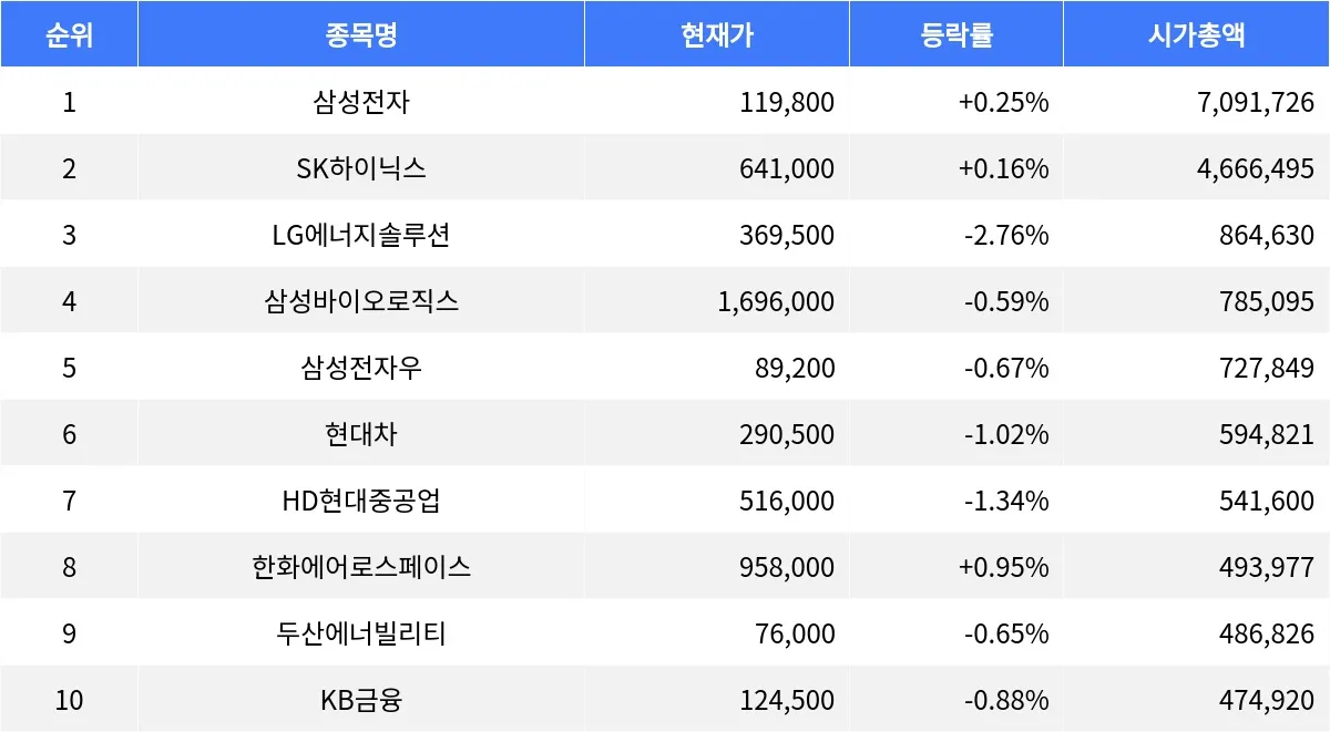 삼성전자 +0.25%, SK하이닉스 +0.16%, LG에너지솔루션 -2.76%...