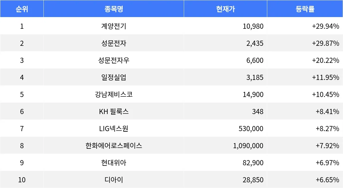8일 장 마감 기준, 계양전기(012200)이 등락률 +29.94%로 1위를 차지했다.