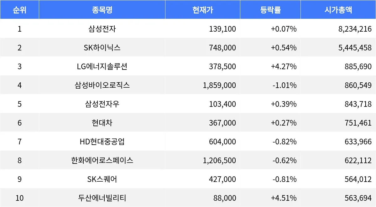 삼성전자 +0.07%, SK하이닉스 +0.54%, LG에너지솔루션 +4.27%...