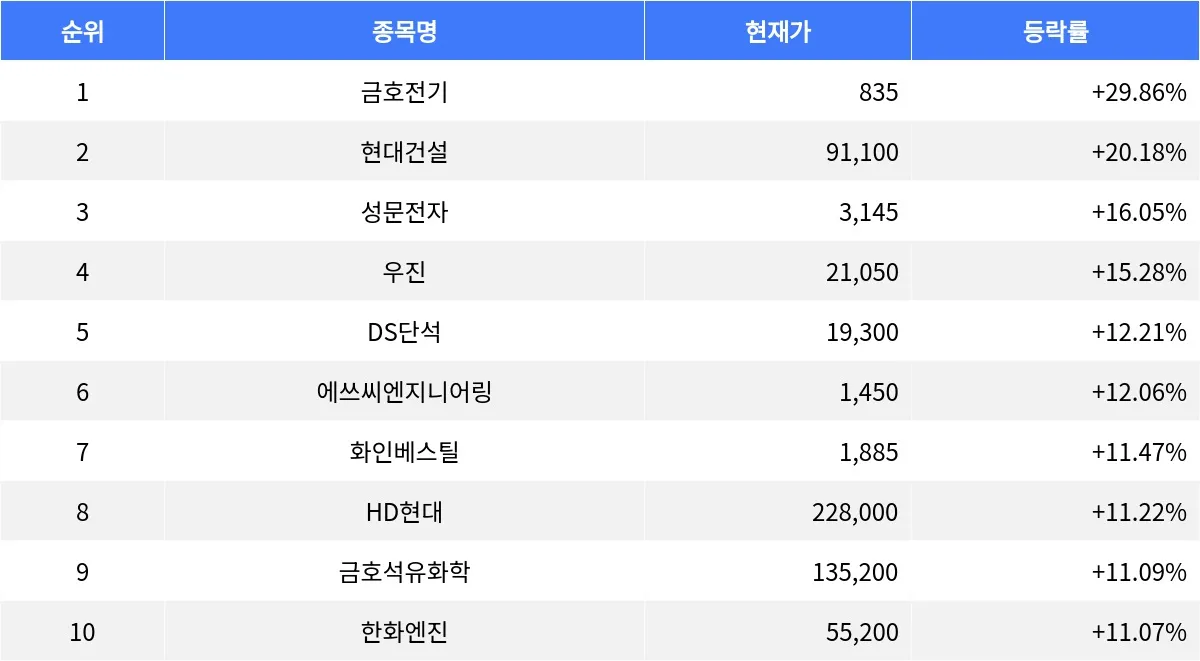 에쓰씨엔지니어링(023960)은 등락률 +12.06%, 현재가 1,450원으로 순위 6위를 기록했다. 화인베스틸(133820)은 +11.47%의 등락률과 1,885원의 현재가로 7위에 올랐다. HD현대(267250)는 등락률 +11.22%, 228,000원의 현재가를 기록하며 8위를 차지했다. 금호석유화학(011780)은 +11.09%의 등락률로 9위에, 현재가는 135,200원이었다. 한화엔진(082740)은 등락률 +11.07%로 10위에 위치하며, 현재가는 55,200원이었다.