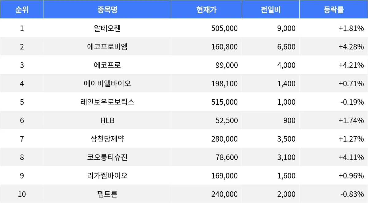 3위 에코프로(086520)는 9만9,000원으로 4.21% 상승 중이며, 거래량은 33만595주이다. 코오롱티슈진(950160)은 4.11% 상승하며 거래량 4만6,775주를 기록하고 있다. 에이비엘바이오(298380)는 0.71% 상승, 리가켐바이오(141080)는 0.96% 상승하며 각각 거래량 2만4,393주와 1만721주를 보이고 있다.