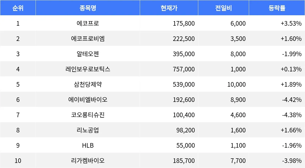 에코프로 +3.53%, 에코프로비엠 +1.60%, 알테오젠 -1.99%...